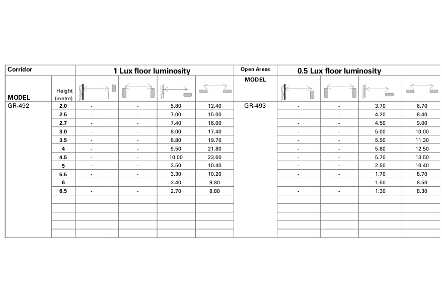 GR-492/WL Produkt InformationenSelbsttestende IP42 Notleuchte in Bereitschaftsschaltung für den Decken Ein- und Aufbau mit drahtloser Kommunikation. Mit Linse für Korridor-Beleuchtung. Horizontal TabsDokumentation Datenblatt Konformitätserklärung Photometrische Daten Photometrische Daten