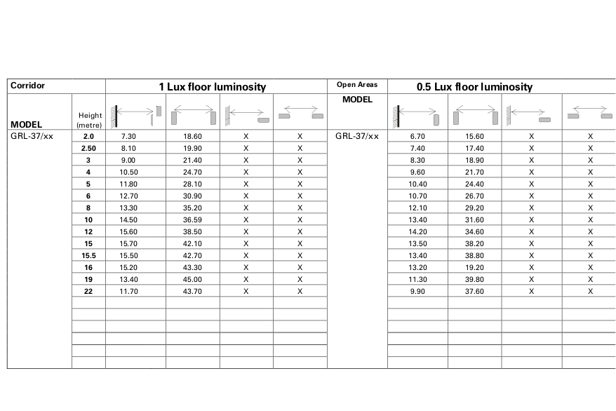 GRL-37/90 Produkt InformationenSelbsttestender Notlichtstrahler in Bereitschaftsschaltung. IP42 Schutzart IK10 Für Wandmontage Horizontal TabsDokumentation Konformitätserklärung Datenblatt Zertifizierungen BSI-Zertifizierung Photometrische Daten Photometrische Daten (wenn die Stahler die gleiche richtung haben) Photometrische Daten (wenn die Strahler 30° nach außen zeigen) Photometrische Daten (wenn die Leuchten um 30° nach außen und um 30° nach unten gedreht werden)